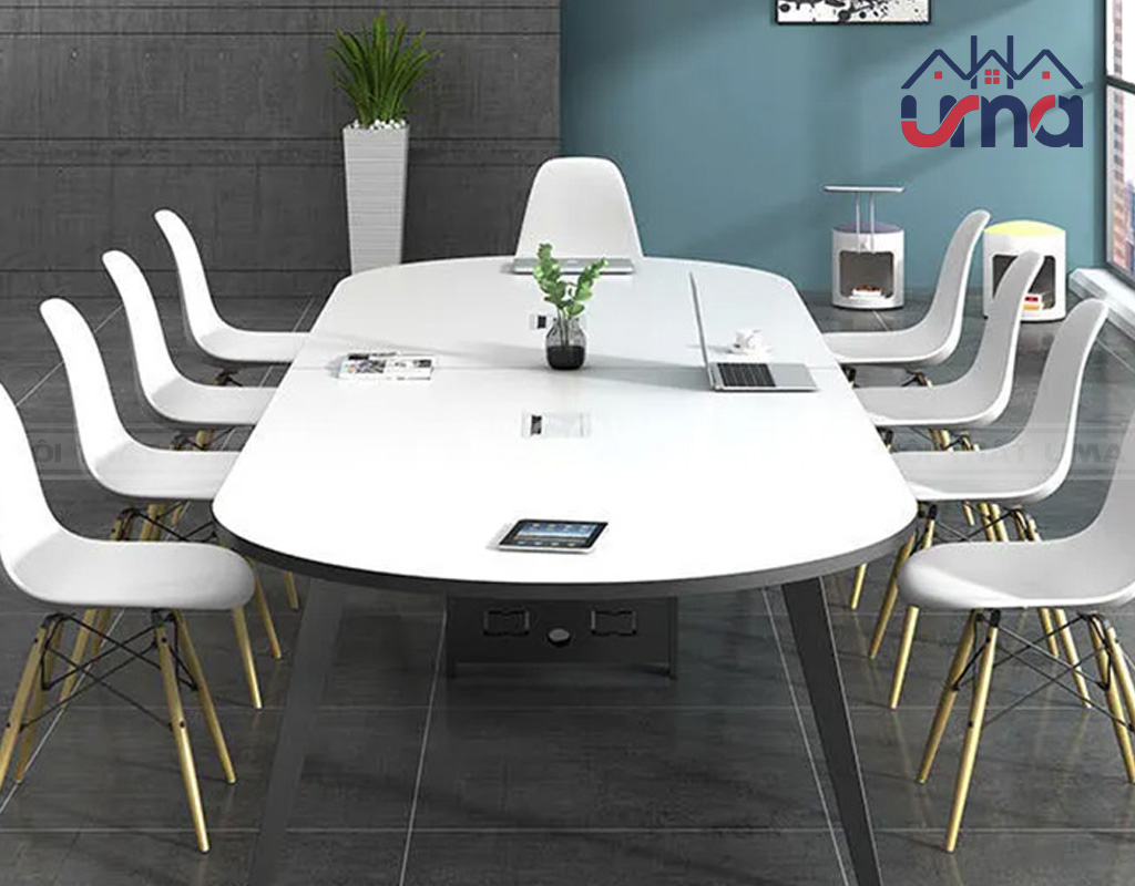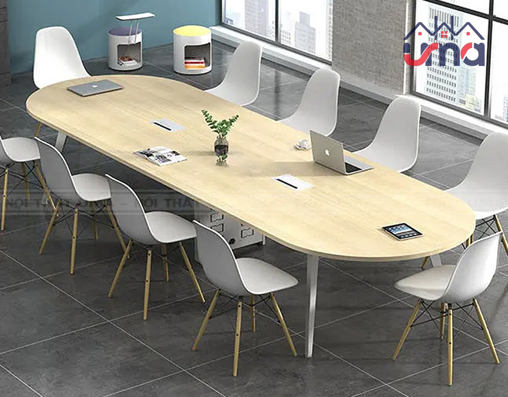- Mặt bàn được thiết kế hình chữ nhật bo góc mềm mại, tạo cảm giác thân thiện, thoải mái khi ngồi họp.