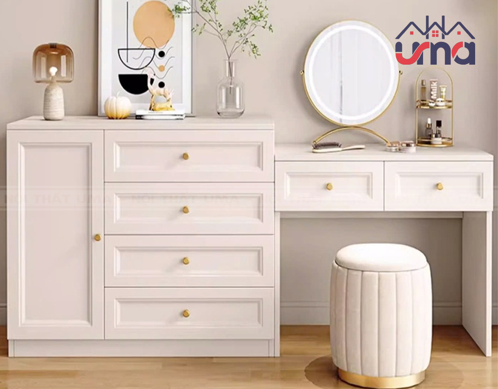 - Thiết kế thông minh giúp tối ưu hóa công năng vừa làm bàn trang điểm, vừa là tủ lưu trữ tiện lợi.