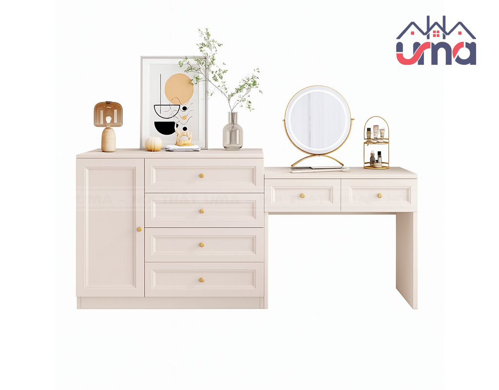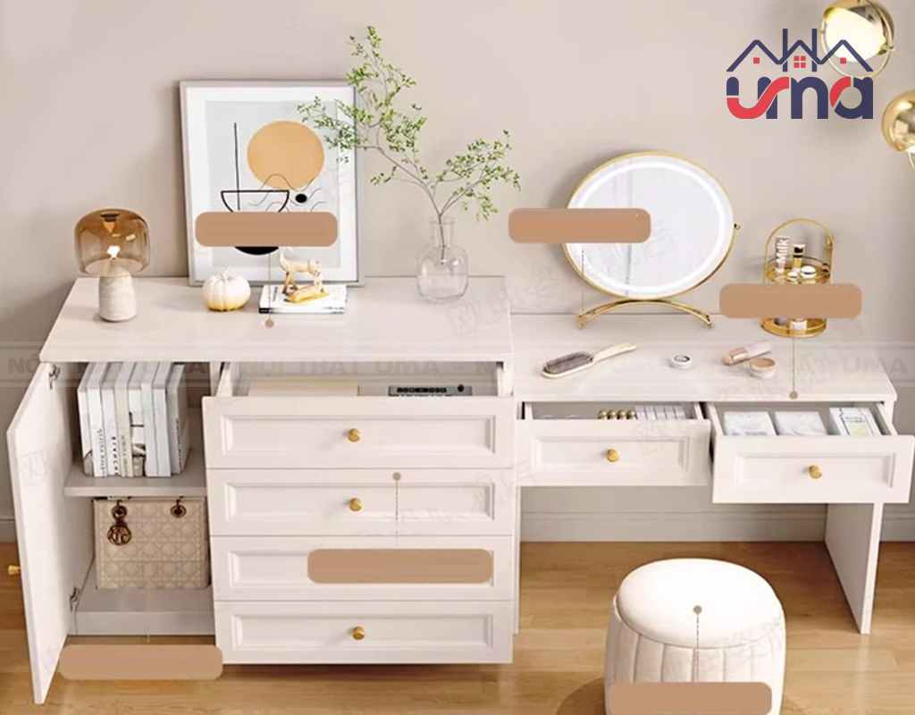 - Tích hợp 5 ngăn kéo và 1 khoang tủ cửa mở giúp phân chia mỹ phẩm, đồ trang điểm và phụ kiện khoa học.
