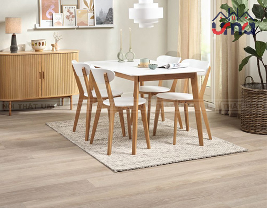 - Bộ bàn ăn này có kiểu dáng vuông vắn, thanh thoát theo phong cách Bắc Âu, phù hợp với nhiều loại hình không gian từ chung cư nhỏ đến nhà phố.