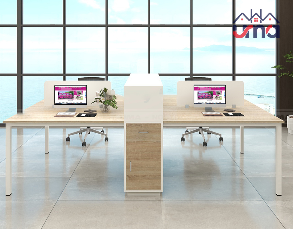 - Cụm bàn của cửa hàng UMA này có kiểu dáng đối xứng với 2 cặp bàn làm việc được ngăn cách bởi vách chắn ở giữa, đảm bảo sự riêng tư cần thiết giữa các vị trí.