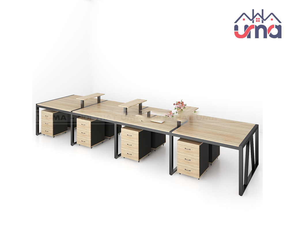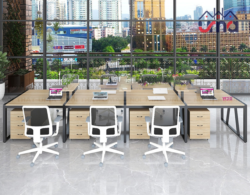 - Mỗi vị trí đi kèm một tủ hồ sơ 3 ngăn kéo riêng biệt, giúp tối ưu hóa lưu trữ và giữ bàn làm việc gọn gàng.