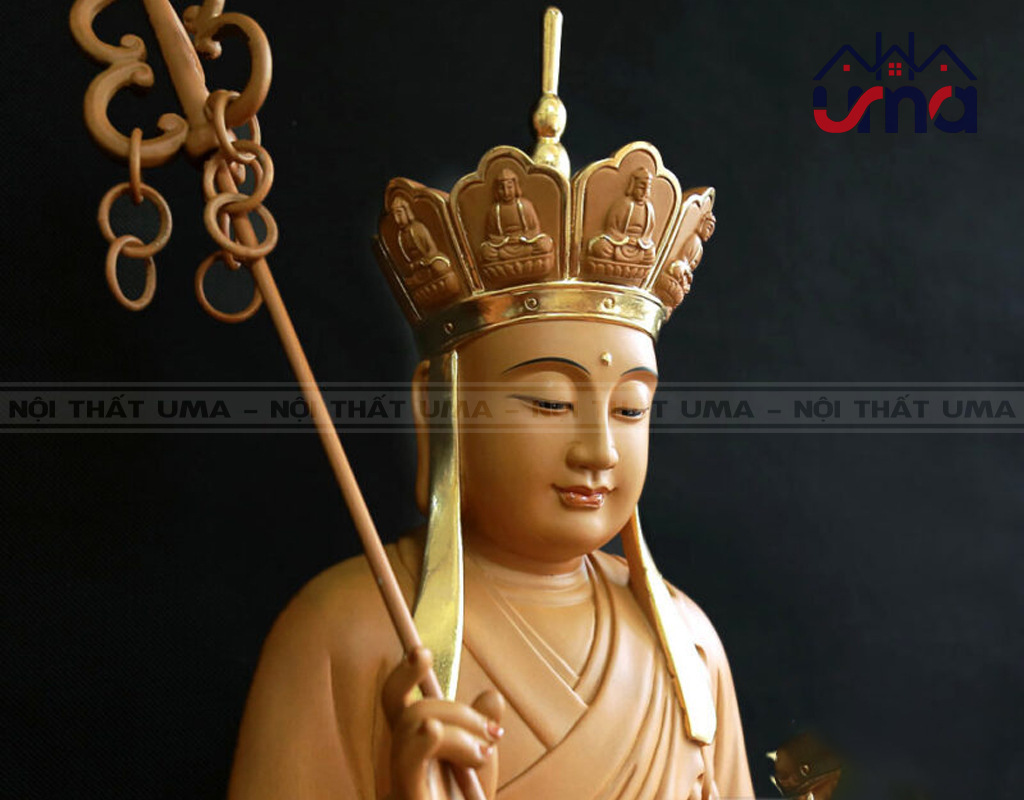 - Tượng khắc họa hình ảnh Địa Tạng Vương Bồ Tát trong tư thế ngồi kiết già trên đài sen, tay trái cầm viên minh châu, tay phải chống tích trượng, ánh mắt từ bi nhưng kiên định.